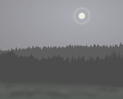 A bright full moon shining over a landscape with wafts of mist and a dark wood. The moon has a lunar rainbow around. Seen on a nocturnal drive along empty roads in an autumn night.