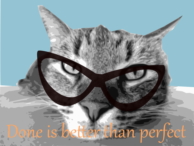This image includes a cat with an eyewear and the words called "Done is better than perfect" .