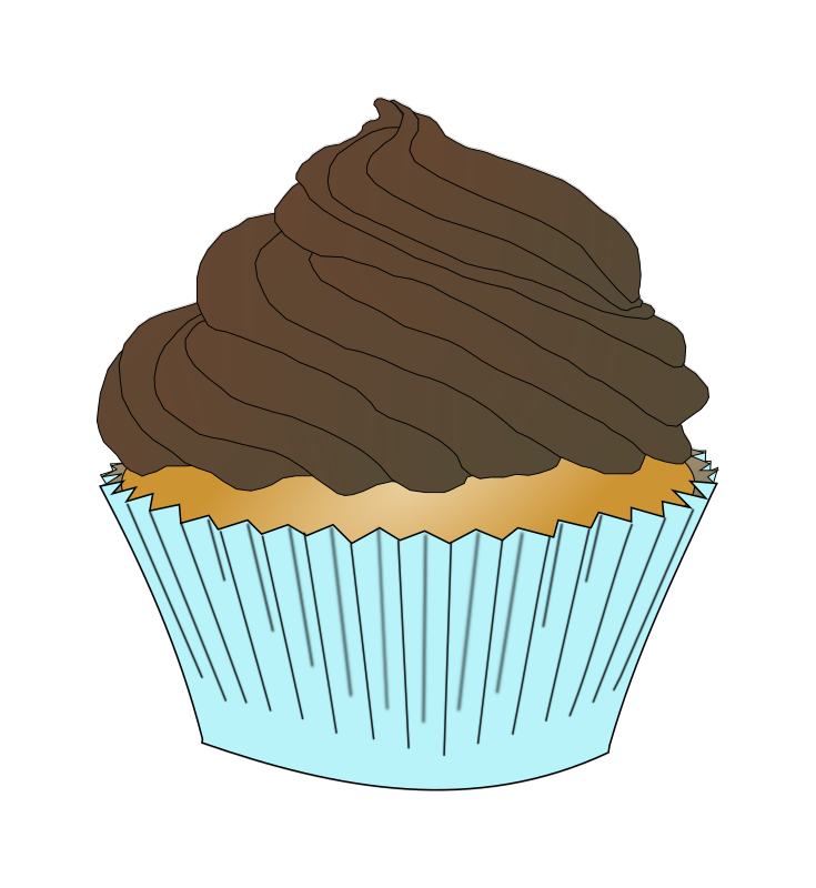 A vanilla cupcake with chocolate frosting and a blue wrapper.