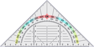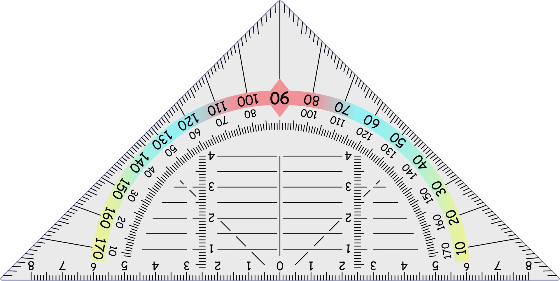 Triangular Protractor Improved. Deconstructed and reimplemented according to tyna32's specifications. Background is a separate object and can be recolored and have its opacity changed easily. Using a gradient instead of banded objects.