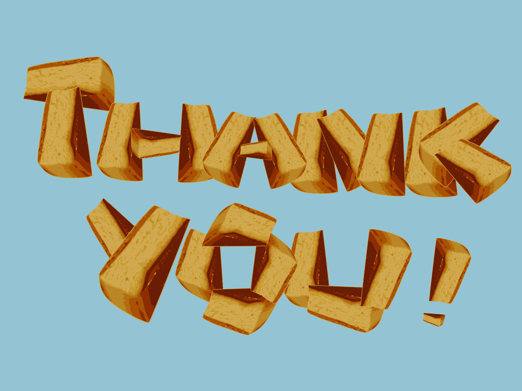 The image is the words "Thank you ! " which is made of twenty-five pieces of cake.