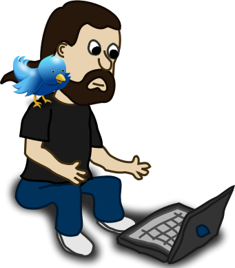 A guy using social media with a bird on his shoulder.