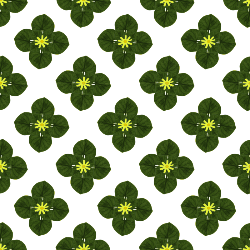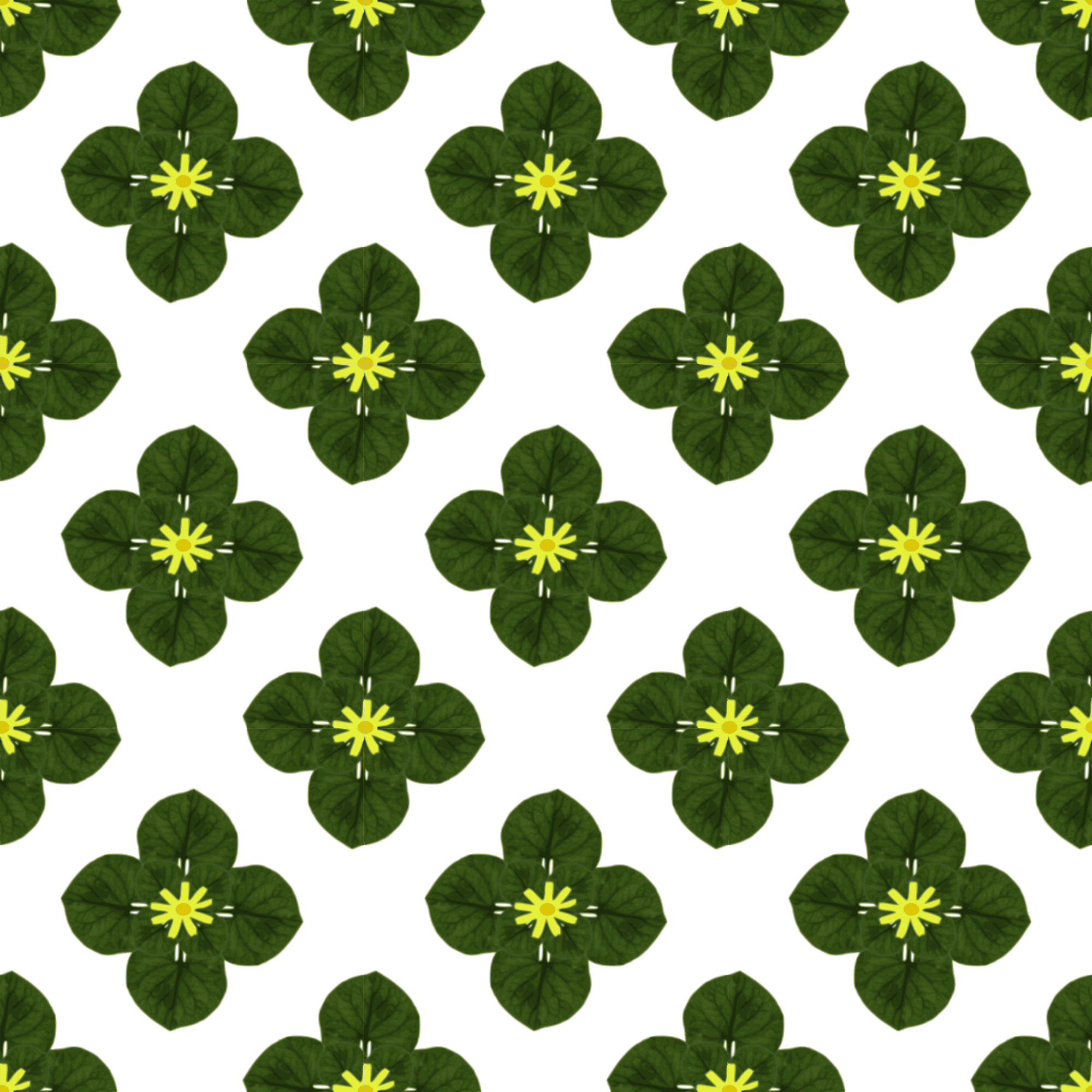 The image depicts a seamless pattern of an imaginary plant which has a yellow flower and dark green leaves.