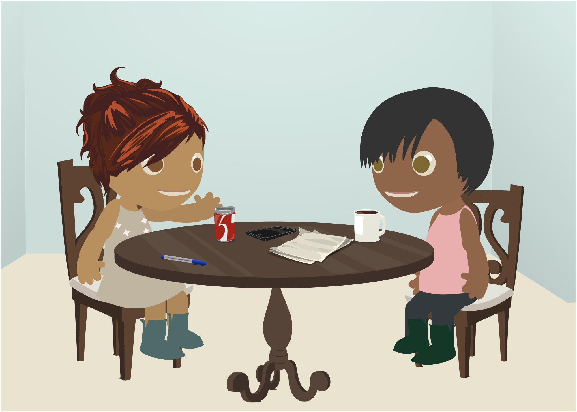 Two women sit at a table, talking animatedly. Another remix made up of artworks from Glitch (glitchthegame.com).