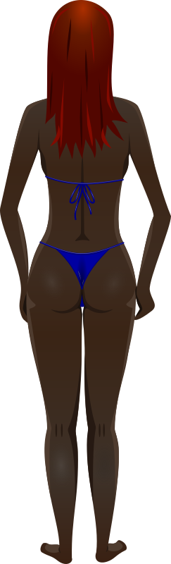 Young lady (dark skin, blue bikini, red hair)