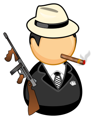 Simplified icon of typical gangster in the 1920s and 1930s USA, with a beige hat, cigar and Tommy gun.