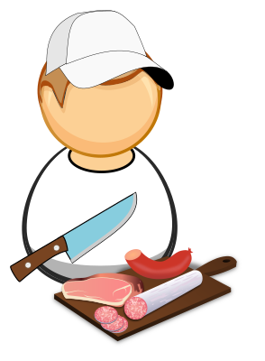 Simplified icon of so called "sausage maker" (kind of butcher) with kife and cutting board with salami, sausage and piece of ham.