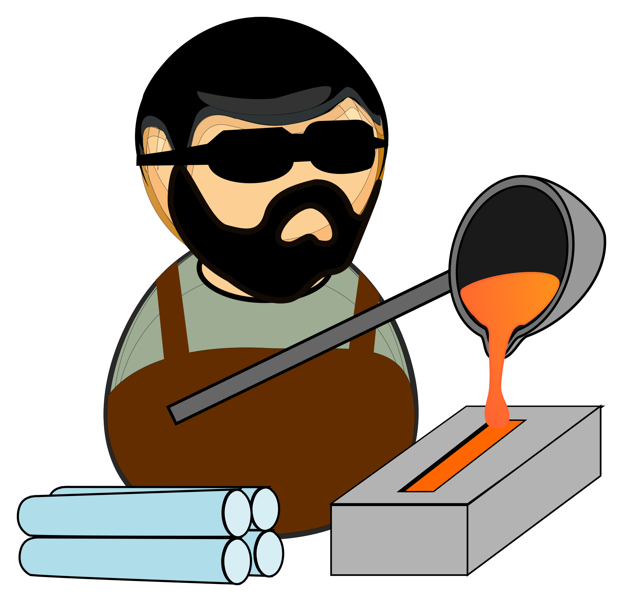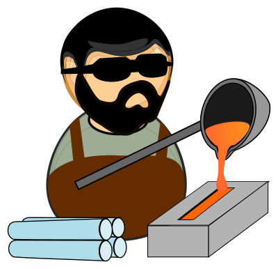 Simplified icon of metallurgist wearing safety goggles, with a melting pot, casting mold and brand new metal rods