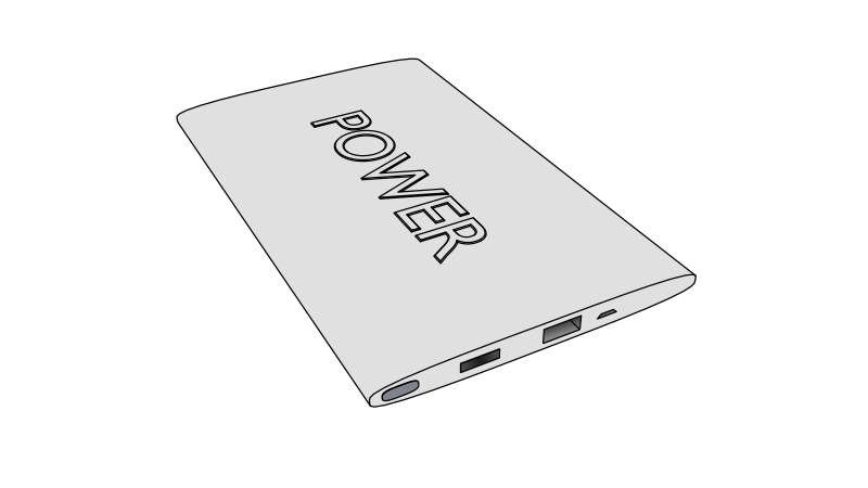 Derived from my 3D model of a power bank, painted using Inkscape. "Power" is not to suggest the name of a brand, and if any such brand already exists, that is an unintended similarity as this is not intended to represent any specific model of any existing device, and characteristics are arbitrary (size, exact shape, button shape, port shape, etc). It is simply portraying a generic device which stores power.