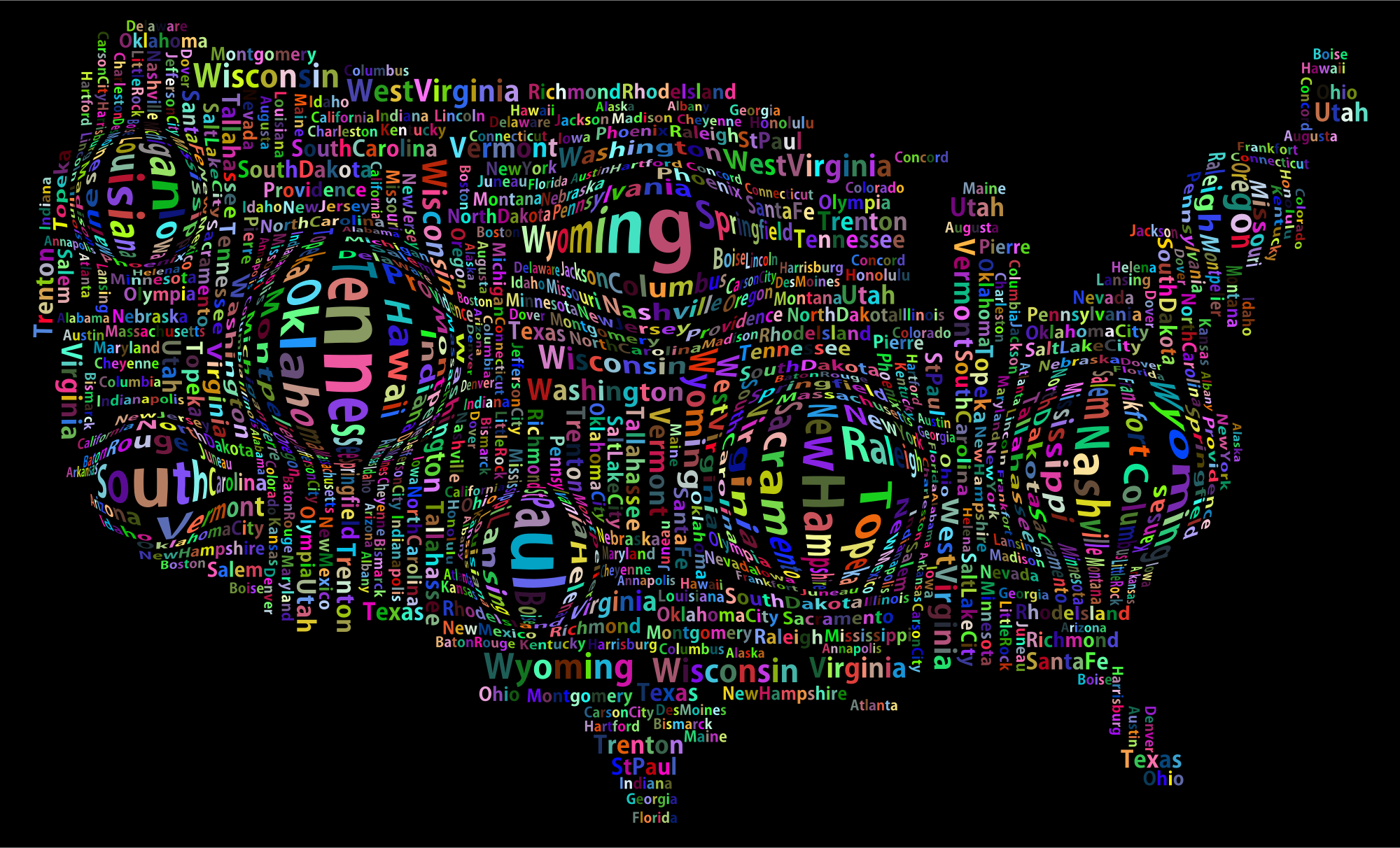 Prismatic Distorted America States And Capitals Word Cloud