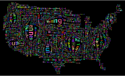 - America Art Borders Capitals Chromatic Colorful Country Geography Map Nation Prismatic Rainbow Tag Cloud Tagcloud Tags Text Type Typography USA United States Weighted List Word Cloud Words