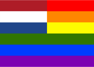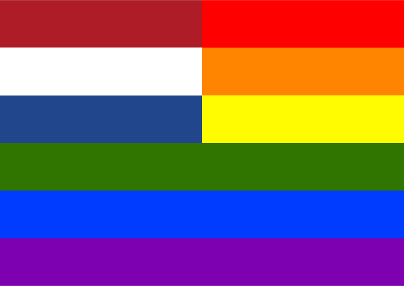 Flag of the Netherlands in front of rainbow flag.