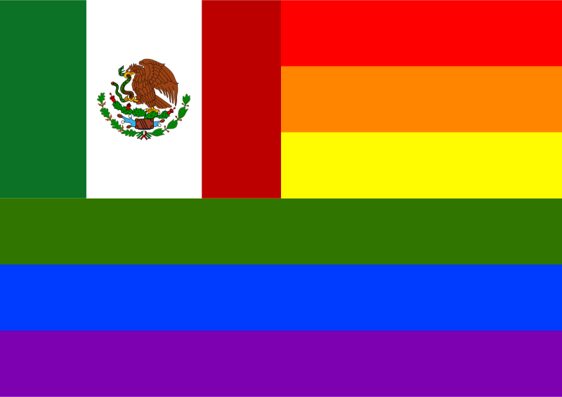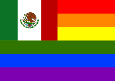 Flag of Mexico in front of rainbow flag.