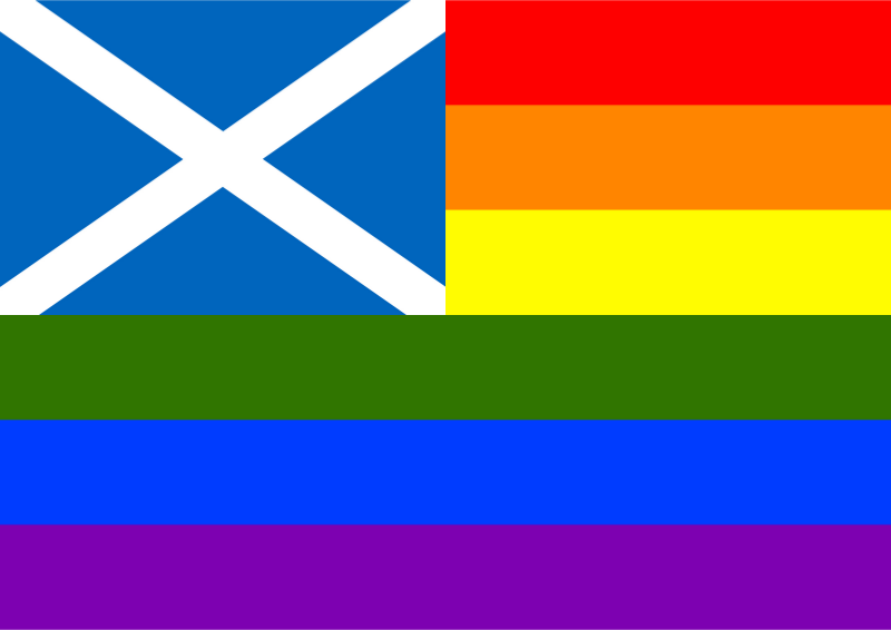 Flag of Scotland in front of rainbow flag.