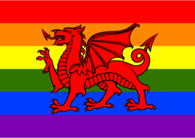 Flag of Wales in front of rainbow flag.