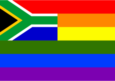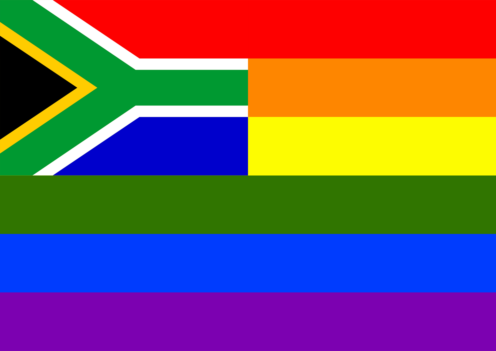 Flag of South Africa in front of rainbow flag.