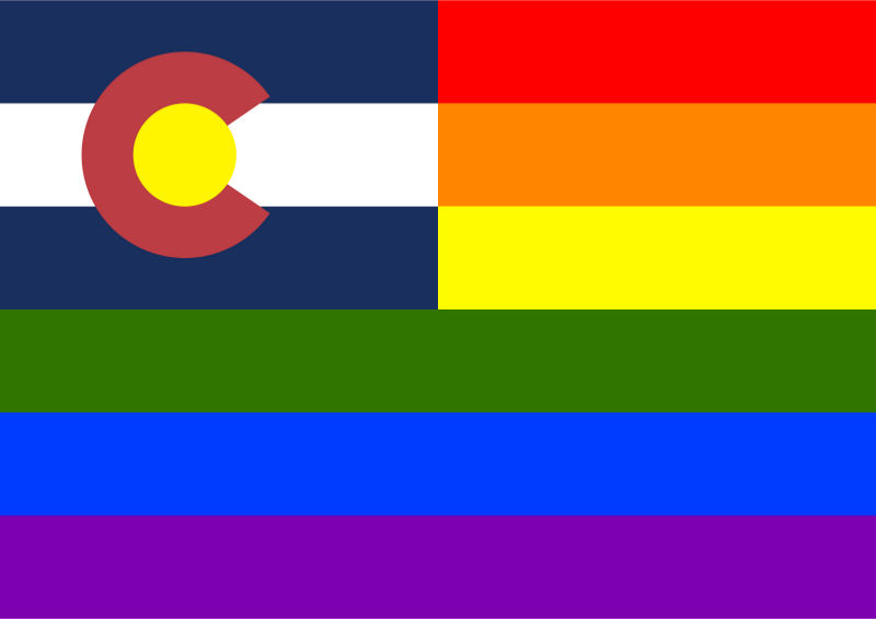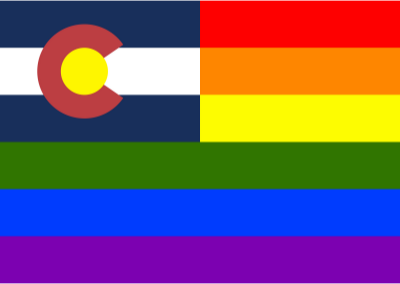 Flag of Colorado in front of rainbow flag.
