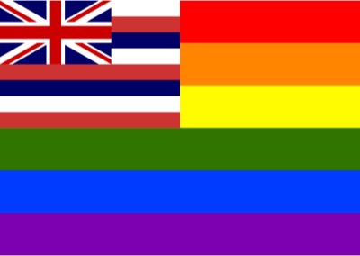 Flag of Hawaii in front of rainbow flag.