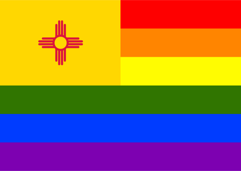 Flag of New Mexico in front of rainbow flag.