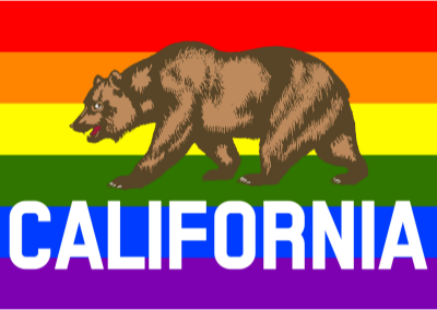 Flag of California in front of rainbow flag.
