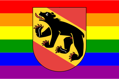 The coat of arms of the Canton of Bern superimposed over the rainbow flag.