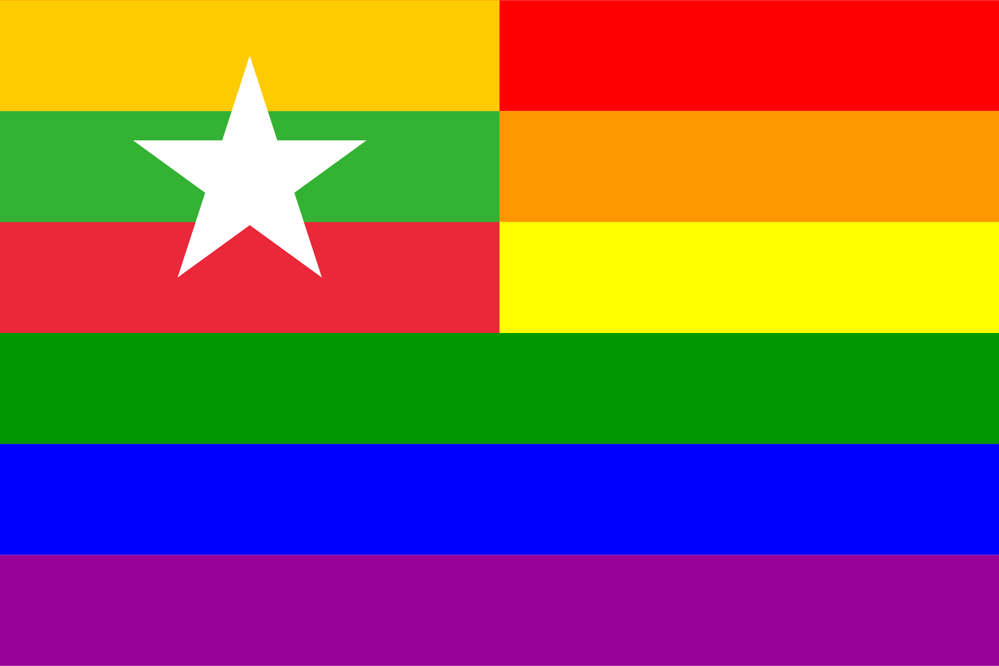 The flag of Myanmar superimposed over the Rainbow Flag.
