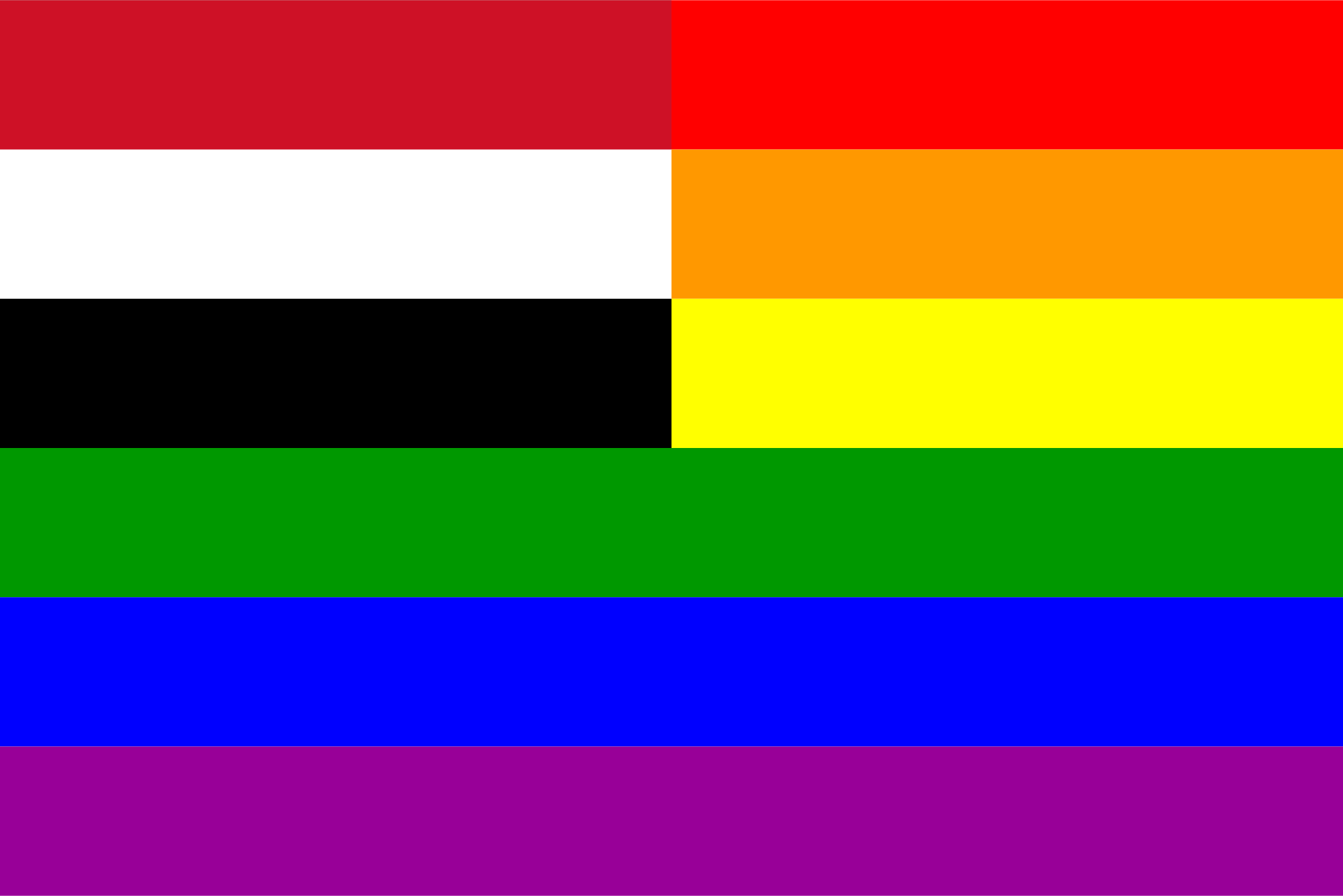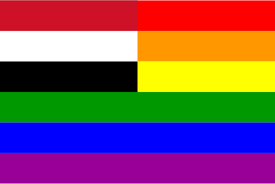 The flag of Yemen superimposed over the rainbow flag.