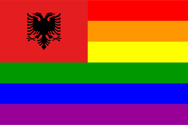 The flag of Albania superimposed over the rainbow flag.