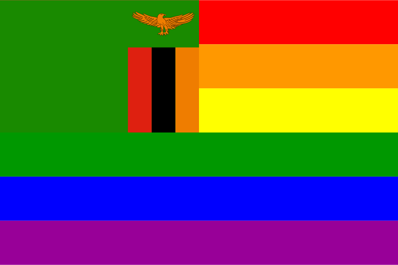 The flag of Zambia superimposed over the rainbow flag.