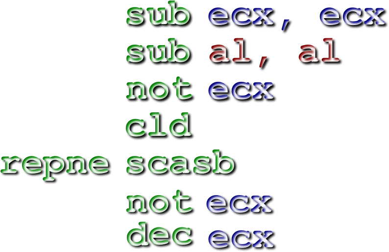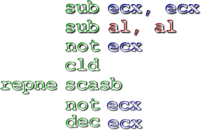 Assembly language code to find the length of a NUL-terminated string, which I posted on http://www.int80h.org/strlen/ (one of my many web sites) back in 2000, now turned into an SVG graphic. It expects ES:EDI/RDI to point at the start of the string. At the end, the length of the string, not counting the terminating NUL, is in ECX.
