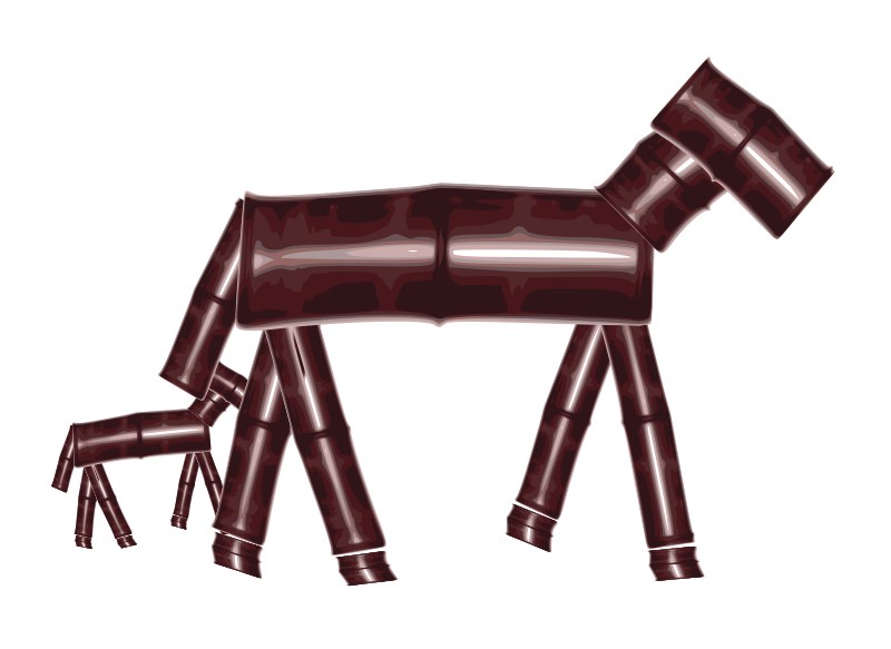 The image depicts a horse and its child which are made of bamboo sticks.