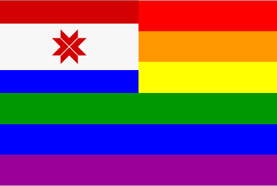 The flag of Mordovia superimposed in front of the rainbow flag. Based on the specifications found at https://ru.wikipedia.org/wiki/Флаг_Мордовии (in Russian).