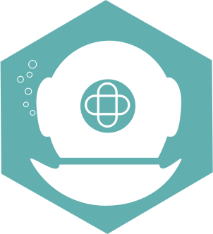 A white icon style symbol for a classic diver-suit-helmet with some air bubbles inside a blue hexagon