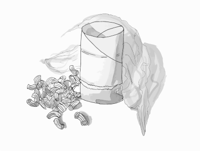 Brown paper tube, pasta and plastic wrap
