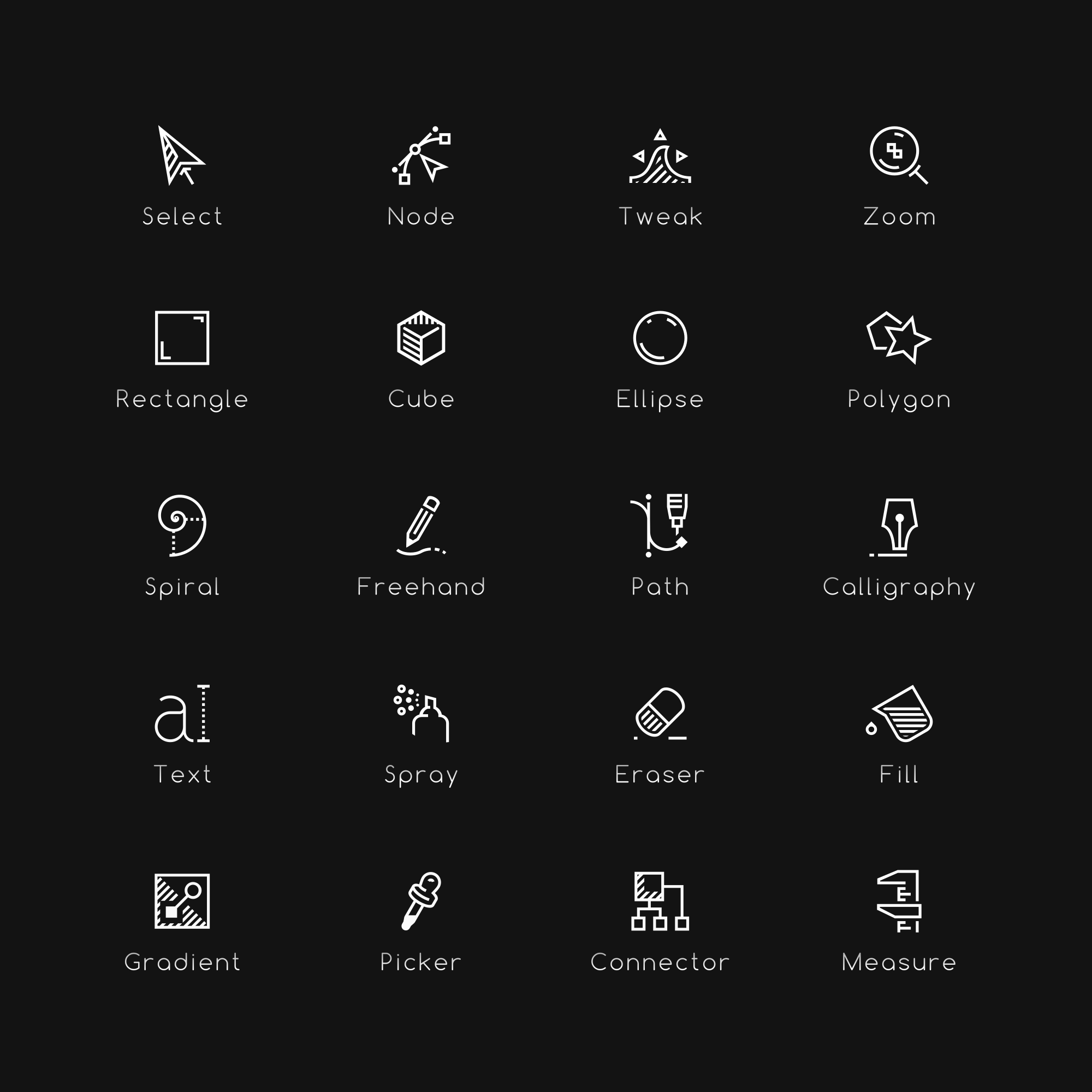 An icon set for the Inkscape main tools, designed for its dark theme. EDIT : background issue in web browser fixed.