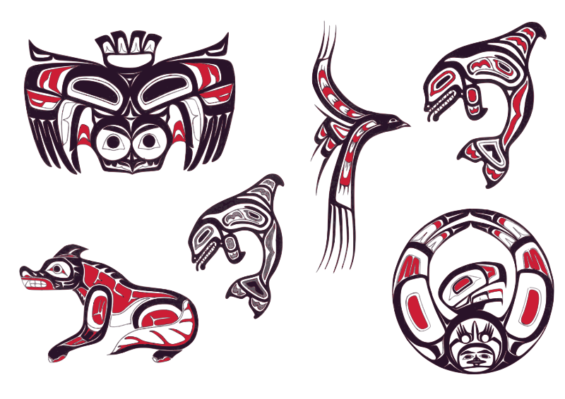 Black, red and grey line art showing stylized animals