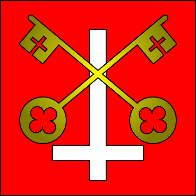 The traditional arms of St Peter, Crossed Keys with an upside down cross of a red field.