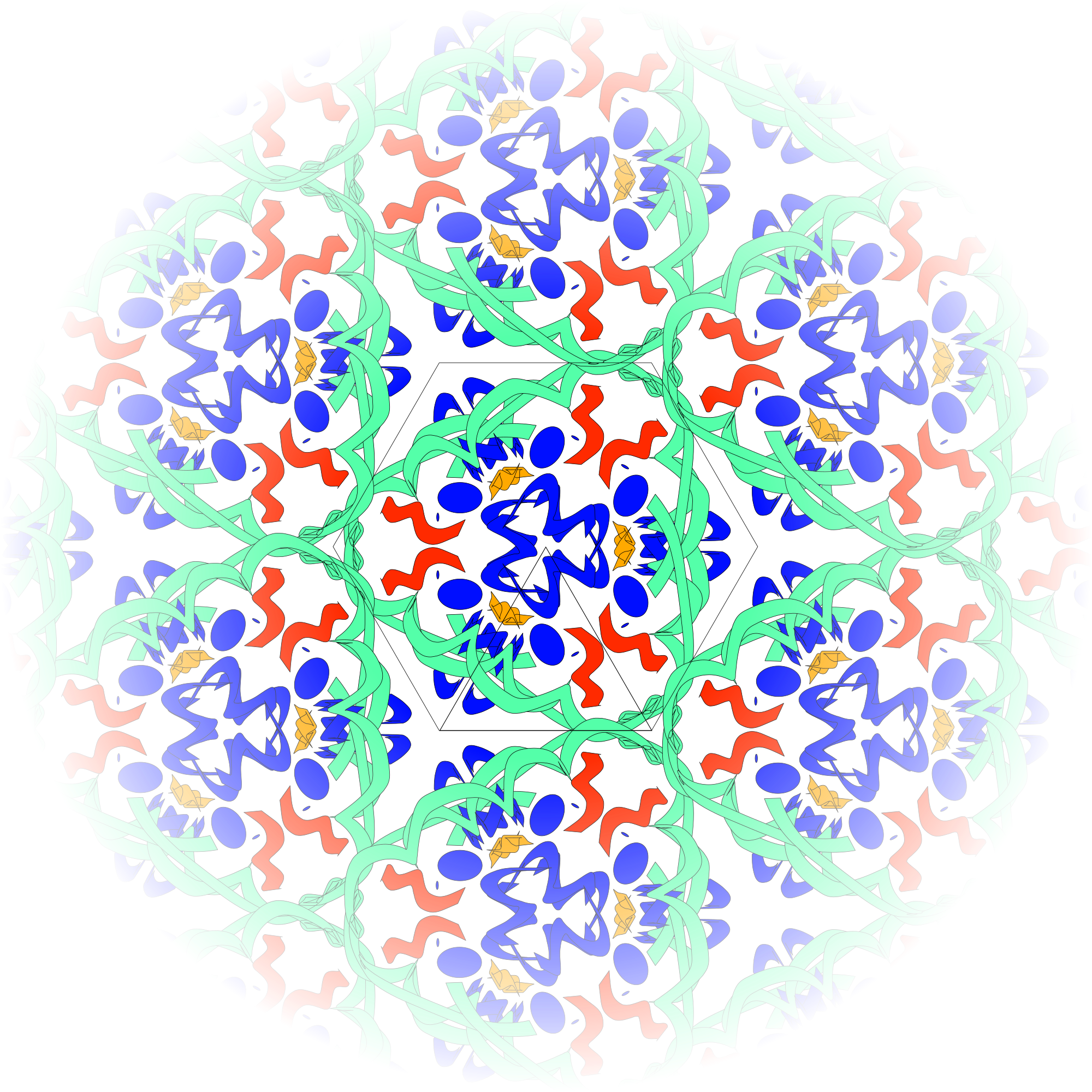 this is an updated version of the kaleidoscope, 3 fold symmetry. It adds repeats of the base unit around the centre, which then fade to zero opacity. acts a bit like a kaleidoscope with three mirrors in. to edit, simply edit the "EDIT LAYER"