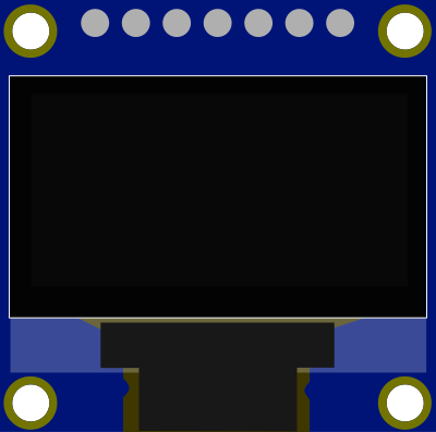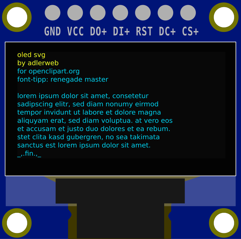 OLED Module with SPI Pinout. Yellow/Blue and Blue examples in SVG. Use a dot-matrix-font like "renegade master" for text.