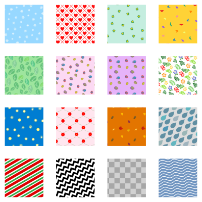 A set of sixteen different seamlessly tileable patterns. 12 of those were made for use in a calendar. The rain pattern has a grey background in Inkscape, no idea why it doesn't show up in Firefox.