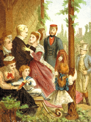 In a 19th century book called 'The Nobility of Life, its graces and virtues, portrayed in prose and verse by the best writers', the illustrator drew scenes to represent human characteristics. This one is supposed to represent affection and was subtitled 'The daughter leaving her father's home'