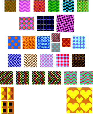 A sampling of patterns from various raster graphics applications of the 1980's and 1990's, vectorized. In SVG view, mouse over the tiles to see which application and platform the pattern comes from.With a pattern of choice, use with the tile or pattern function of your favorite vector/draw application. The tiles have scaled up for better viewing. So depending on your preferences, you might want to resize down a little so the patterns appear less "chunky"