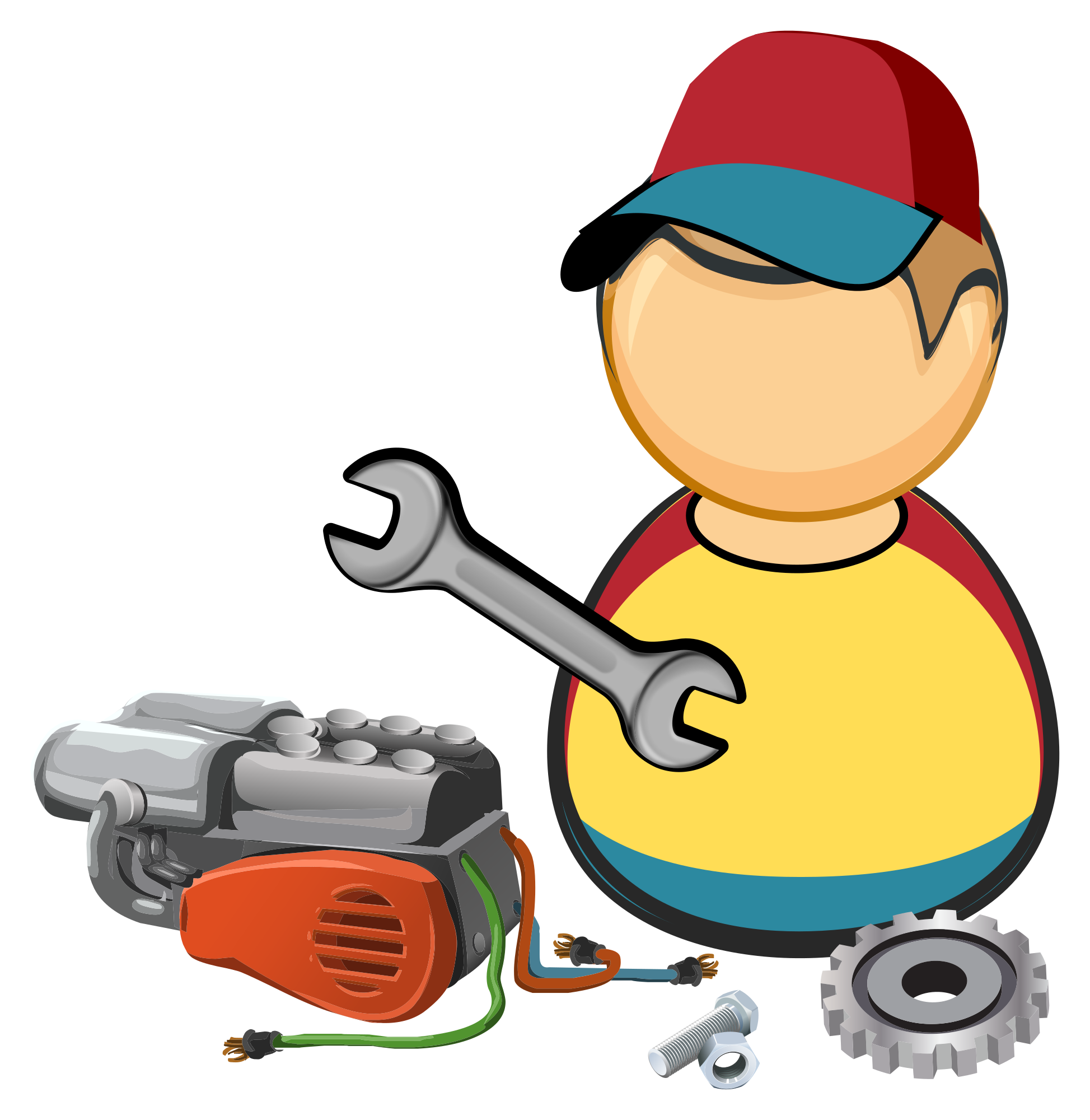 Simplified icon of a guy with a wrench, combustion engine, gears and some screws.