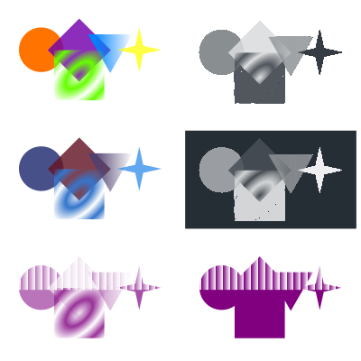 Solid fill, fading gradients, lowered opacity, lowered alpha channel, masking, clipping, compositing by filtering is presented in the image.