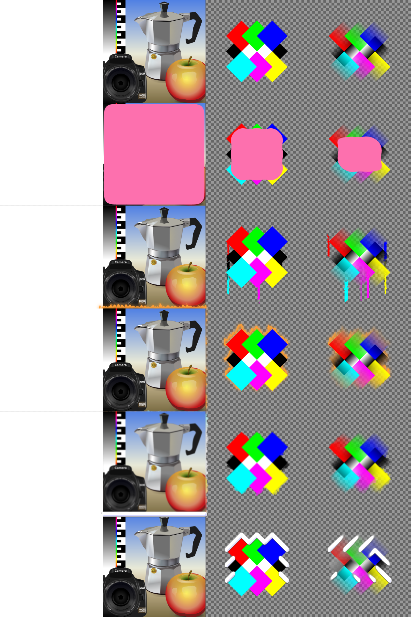 Inkscape filter presets, called "Protrusions" from the filter menu, including: Chewing GumDrippingFireInk Bleed Snow CrestDrawn with inkscape 0.92 in 2017 February.