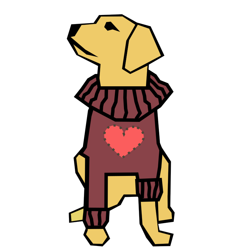 A yellow dog wearing a sweater with a big red heart on it.