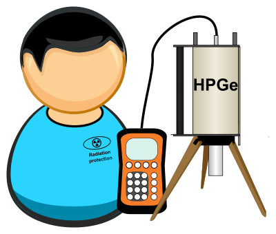 Simplified icon of male field worker with HPGe semiconductor detector and control unit.