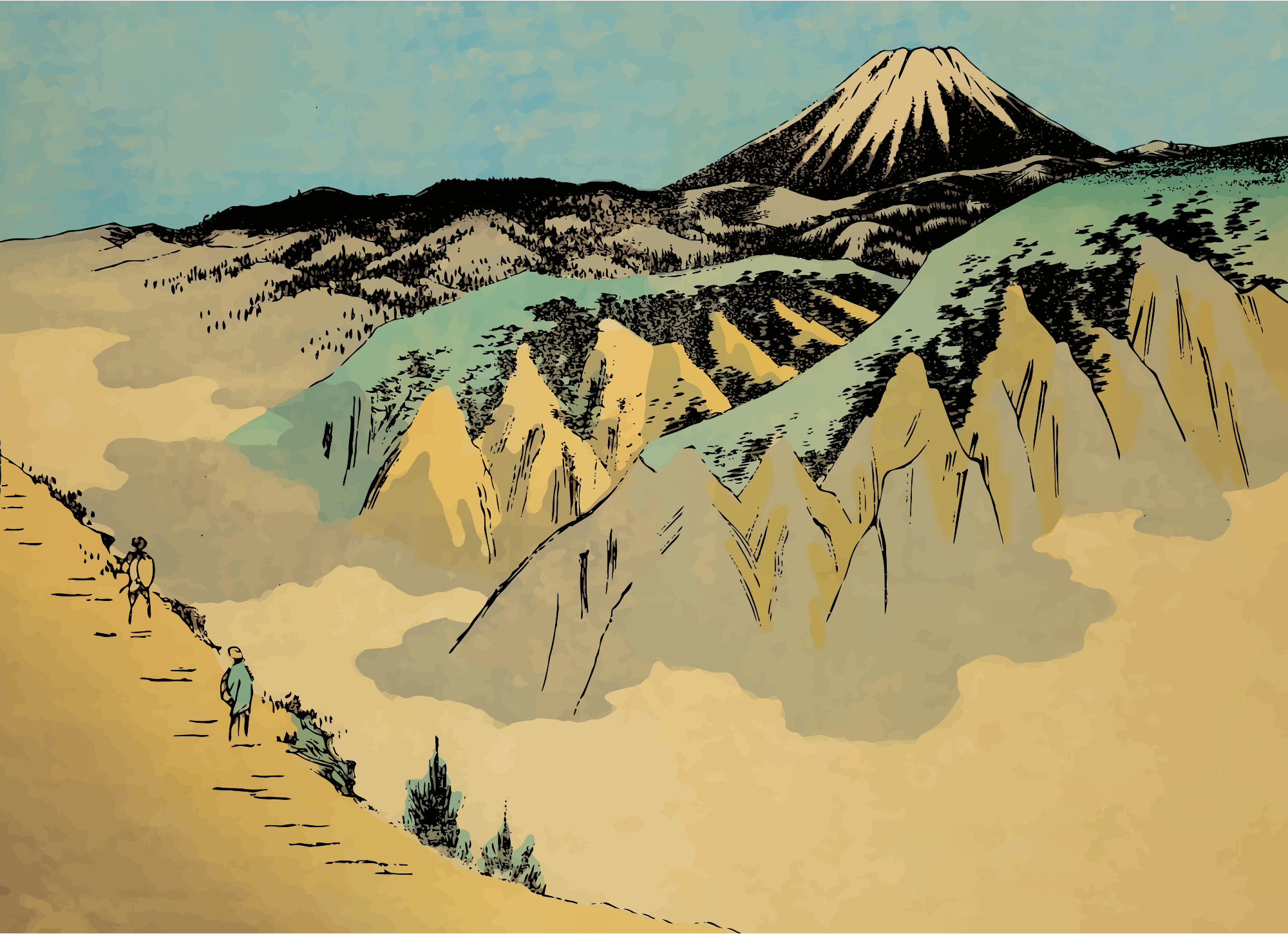 1859 illustration by Utagawa Hiroshige in 'One Hundred Views of Mount Fuji'. Stitched together the two halves on different pages of the original book and hid the seam. Covered up the shaped corners, removed the border and made the sky look more realistic.