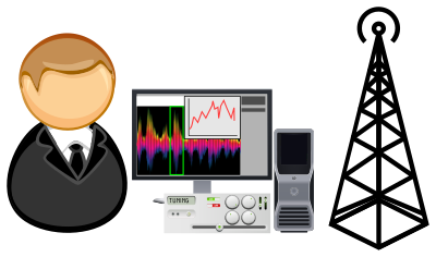 Simplified icon of a signal analysis worker with computer, antenna, analyser and display with spectrum