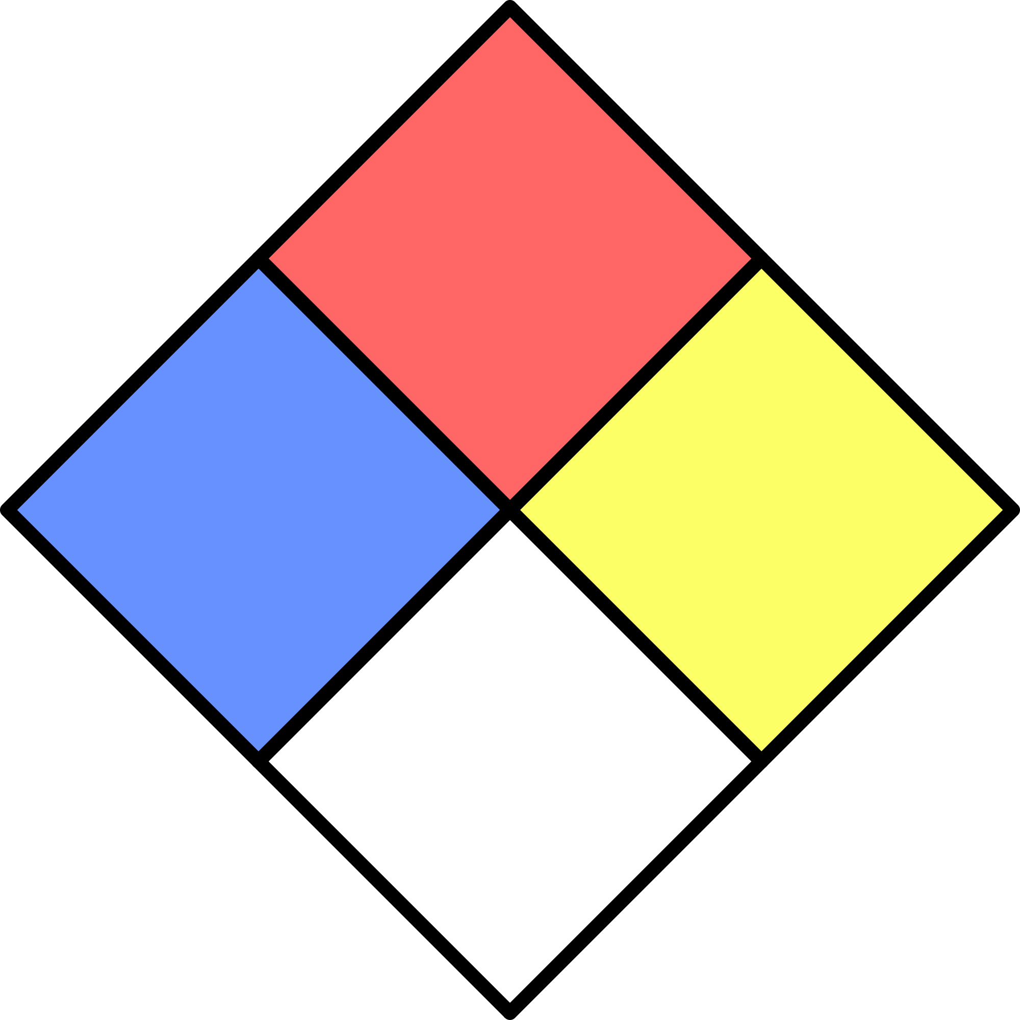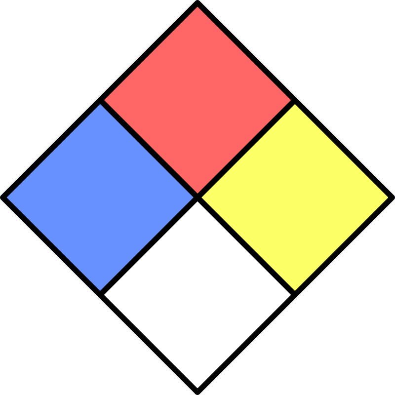 U.S.-based National Fire Protection Association standard fire diamond for flagging risks posed by hazardous materials. The red diamond has a number 0-4 depending on flammability. The blue diamond has a number 0-4 depending on health hazard. The yellow has a number 0-4 depending on reactivity. the white square has a special notice, e.g OX for oxidizer.